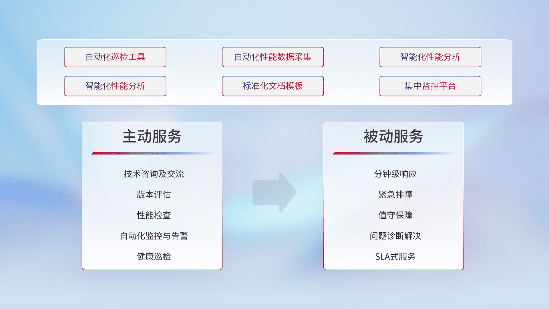 智能化工具和标准化文档,,保障服务质量,,,,提供主动服务(包含技术咨询、、版本评估、、性能检查、、自动化监控与告警、、、健康巡检)和被动服务包含(分钟级响应、、紧急排障、、、、值守保障、、、、问题诊断解决、、SLA服务)。。。。