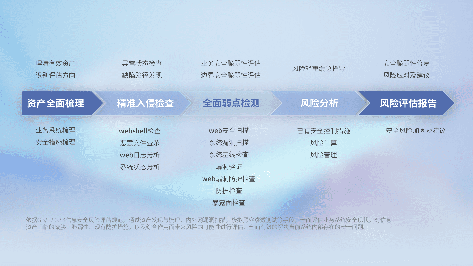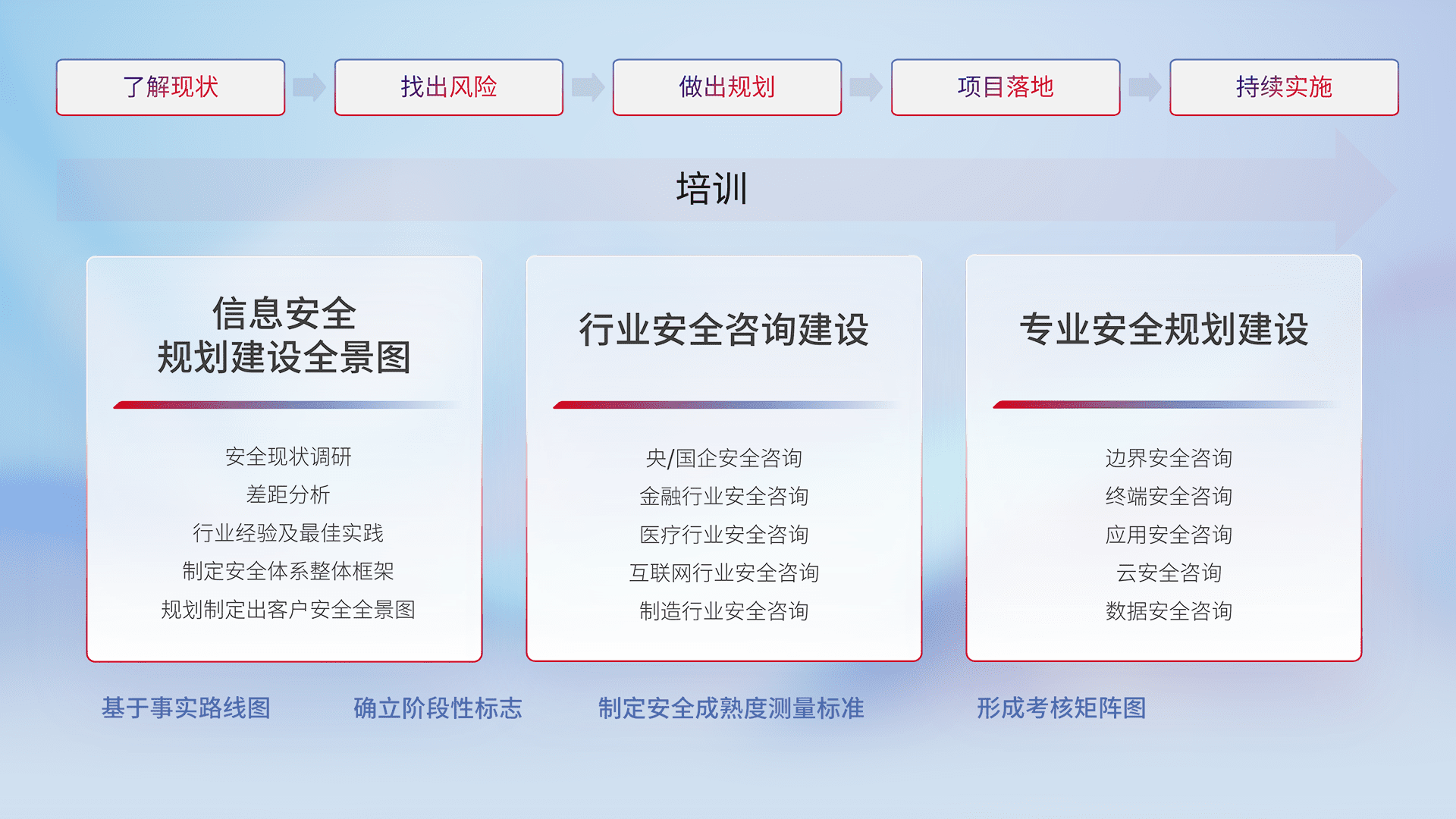 针对客户行业特性,,,,以专业的安全服务+多厂商联合解决方案提供专属的一站式安全管理服务,,帮助客户全面感知网络空间威胁,,,基于识别、、、、检测、、分析、、、防护、、监测、、、、响应的服务理论模型,,,,从方案咨询、、集成交付、、、、评估验证、、、优化加固、、运维运营,,,致力于为客户提供完整的闭环管理式安全服务。。。以实战经验为客户打造高抵御风险的安全体系,,,帮助客户发现威胁、、、、对抗威胁、、、、处置威胁,,不断积累安全对抗能力,,持续保障数字化安全。。